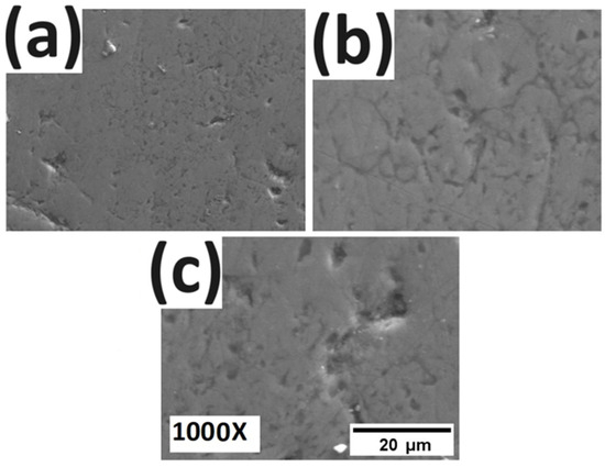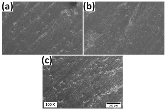 The diffractograms of the powders of the Mg–Zn alloys for the three compositions as the grinding time passes (Figure 6, Figure 7 and Figure 8), a decrease in the size of the peaks and a certain amorphicity of these are observed because a decrease in size occurred of crystallite. There was deformation in the crystalline network, all this is related to the collisions suffered during the grinding process. Still, the XRD of the sintered samples (Figure 9) showed some certain crystallinity and an increase in the intensity of the peaks, these are due to the energy supplied during the sintering treatment which causes the atoms of the crystallized network to be ordered and that makes their detection by XRD easier. Figure 10 shows the micrographs of the Mg–Zn alloys cold compacted and sintered at 400 °C for 3 h. The sintered Mg–Zn samples presented a good union and distribution between the Mg matrix and the Zn particles as a result of the effect of the pressure and temperature applied during the sintering process, which causes the porosity of the particles to decrease due to the union of these during the sinetrization treatment.