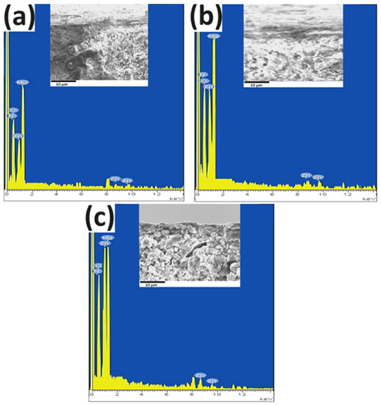 SEM–EDS at the cross-section of the nitrided samples: (a) Mg95–Zn5, (b) Mg90–Zn10, and (c) Mg85–Zn15.