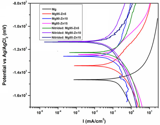 - Potentiodynamic polarization curves displayed that pure Mg had lower corrosion resistance and a higher corrosion rate than the Mg–Zn alloys and nitrided samples, demonstrating that the Zn content and nitrides formed on the analyzed specimens can benefit from a protective layer on the surface of specimens, thereby increasing corrosion resistance and decreasing the corrosion rate in Hank’s solution.