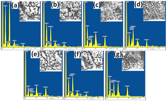 SEM–EDS (a) Mg, (b) Mg95–Zn5, (c) Mg90–Zn10, (d) Mg85–Zn15, (e) nitrided Mg95–Zn5, (f) nitrided Mg90–Zn10, and (g) nitrided Mg85–Zn15 after the potentiodynamic polarization tests.