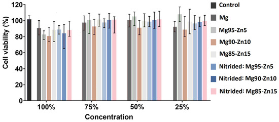 Figure 17 shows the cell viability of the fibroblasts after incubation for 96 h. In the case of the solutions containing 100% extract, the dendrite-shaped cells attached after incubation for 96 h proliferate comparably to the control (Figure 18), consistent with the RGR results (Figure 17). Figure 18 indicates that fibroblast cells can proliferate normally in solutions of the extracts Mg, Mg95–Zn5, Mg90–Zn10, Mg85–Zn15, nitrided Mg95–Zn5, nitrided Mg90–Zn10, and nitrided Mg85–Zn5, exhibiting good cytocompatibility. There was a greater increase in cell viability with the decrease in extract concentration, indicating that the extracts promote cell growth. The RGR results for the tested samples indicate that they are not toxic to fibroblast cells and, thus, could be considered for use in biomedical applications.