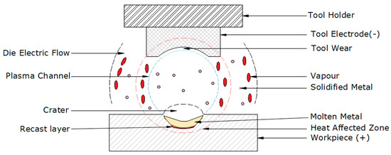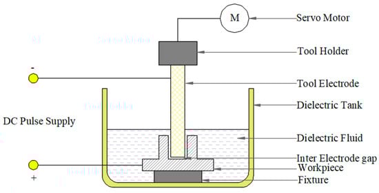Electrical discharge machining (EDM) is a non-traditional machining process used to shape metal parts by employing electrical discharges or sparks [4]. This method is highly effective for machining intricate shapes and hard materials that are otherwise challenging to process using conventional machining techniques [5]. During the EDM process, material removal occurs due to the electrical discharges between the tool and the workpiece. Both the tool (electrode) and the workpiece, submerged in dielectric fluid—commonly deionized water or oils—serve as a medium for electrical conduction and help in flushing away debris [6]. Figure 1 and Figure 2 show the EDM machining setup and process.