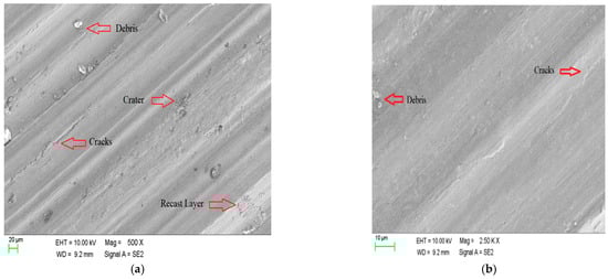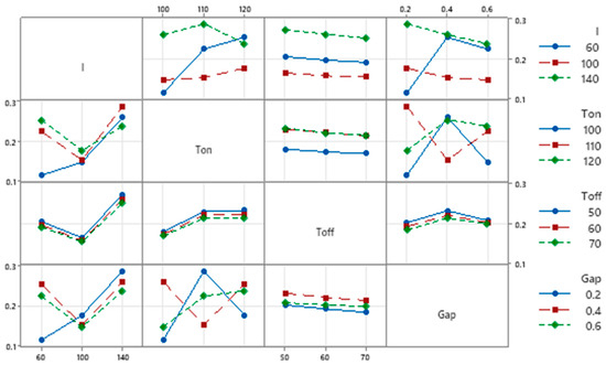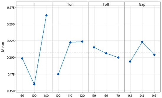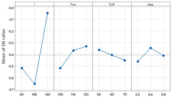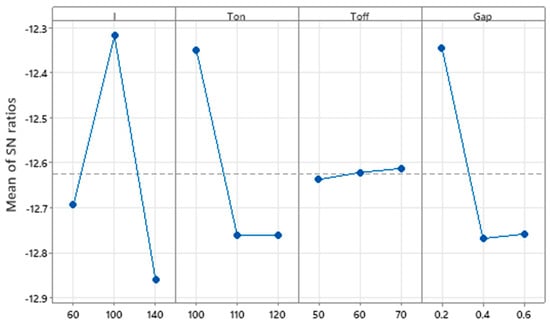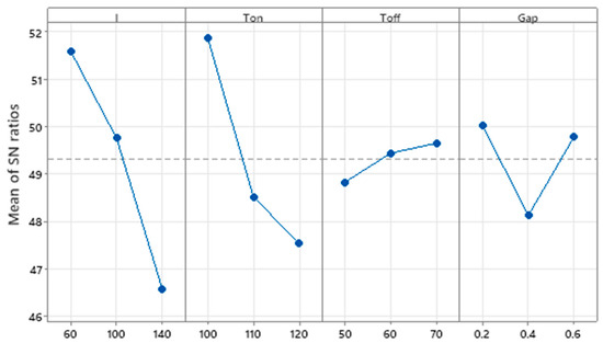 Taguchi-based analysis was incorporated to optimize process parameters MRR, based on the SNR to find the combination to maximize the response MRR parameter and is shown in Figure 3. Figure 3 explains that the initial increase in current reduces the MRR value, yet a further increase in current allows the MRR to grow. This can be attributed to the fact that the MRR is directly proportional to the current. The increase in current develops more energetic sparks that lead to an increase in the erosion of the material and MRR [77]. The increase in pulse ON time increases the MRR due to the increased discharge time of high-frequency sparks in the work zone. The shorter pulse duration reduces the spark energy, and the minimum discharge time leads to lower MRR. Increased pulse ON time produces longer spark durations, and the heat energy produced is sufficient to cause larger craters to form on the work piece’s material, increasing the rate of material removal. The increased pulse OFF time reduces the contact time of spark energy with the workpiece and subsequent spark development will decrease with the increase of Toff time which leads to a drop in MRR. The increase of Toff time increases the dielectric fluid flow which leads to a hardened working zone, and this hardening effect will reduce the MRR. High thermal energy is developed during the smaller gap between the tool and the workpiece due to the high thermal energy, and the workpiece material is liquefied and evaporated quickly, leading to increase in the MRR.