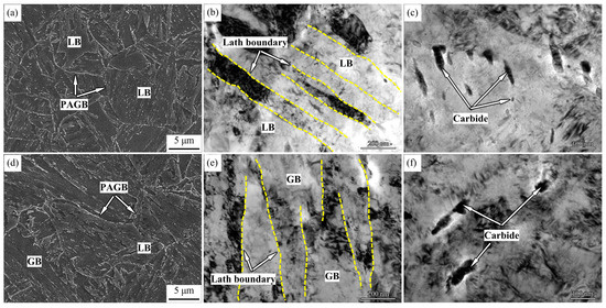The SEM micrographs and TEM images of the head and end samples are depicted in Figure 2. The morphological structures at the head are characterized by typical lath bainite (LB), while those at the end are composed of LB with some granular bainite (GB) (Figure 2a,d). In addition, the lath boundary and prior austenite grain boundary (PAGB) are decorated with bright and fine carbides in both samples. In the TEM images (Figure 2b,c,e,f), the width of structures at the head is ~100−200 nm, which is finer compared with that at the end with a width thicker than 200 nm. Carbides with a size of ~50–100 nm can be observed in both samples.