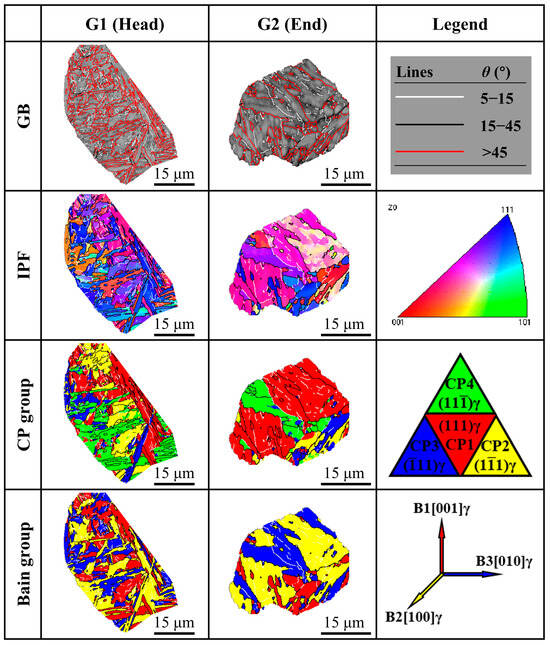 To further analyze the microstructural heterogeneity of the samples, an inspection was conducted to visualize and digitize the crystallographic features. Figure 4 shows the structures of representative grains highlighted with yellow dotted lines in Figure 3a,b. One can see from the GB and IPF maps that the G1 grain from the head exhibits a higher density of HAGBs and finer structures than the G2 grain from the end. In this study, the 24 variants transformed from the representative grain were classified as four CP groups and three Bain groups which were highlighted with four and three colors, respectively. It is noticed from the CP and Bain group maps that the boundaries between variants in the same Bain region are LAGBs (white lines), while the boundaries between variants belonging to different Bain groups are HAGBs (black lines). Interestingly, most of the CP regions in the G1 grain are occupied by different fine Bain groups, implying that variants from distinct Bain groups are preferentially formed. In contrast, the CP regions in the G2 grain are inclined to an arrangement with the same coarse Bain groups, which is detrimental to the formation of HAGBs.