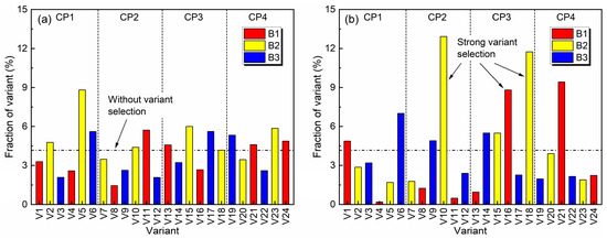 Digitization of the crystallographic features in the representative grains: fractions of the variant in the G1 (a) and G2 (b) grains.
