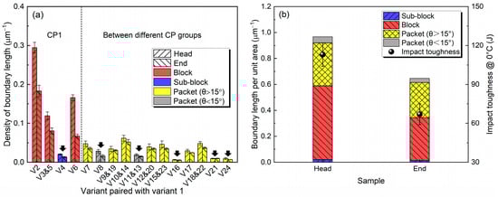 For better comprehension of the relationship between intervariant boundaries and impact toughness, the intervariant boundaries were further categorized into block, sub-block and packet boundaries according to the boundary types [13,15], and the densities of the intervariant boundaries were calculated. As shown in Figure 6a, the head exhibits a significantly higher density of block boundaries from different Bain groups than the end, which is a result of its weaker variant selection [8,36]. Previous studies have shown that a lower starting temperature of transformation can be triggered by a higher cooling rate, and thus a greater driving force for phase transformation can be obtained [8,35,37]. In this work, the higher cooling rate in the head provided a greater driving force, more variants from distinct Bain groups formed and the block width became finer, thus accommodating greater transformation strain [15,38,39]. Figure 6b summarizes the boundary density and impact toughness. The density of block boundaries shows a similar tendency with that of the impact toughness, suggesting that a HAGB dominated by block boundaries is the key factor affecting the toughness, consistent with the results in refs. [9,27,40,41,42]. Therefore, the high cooling rate in the head weakened the variant selection, resulting in the high density of block boundaries and impact toughness.