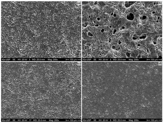 SEM micrographs (secondary electrons mode) of the top surfaces of the anodized ZK60A alloy with and without the addition of graphene oxide are shown in Figure 1. The anodized layer without the incorporation of GO (Figure 1a) displays a flat surface, permeated by microcracks and pores with small diameters that can be more easily observed in the SEM-BSE micrographs (backscattered electrons mode) shown in Figure S1a (Supplementary Files). By adding 0.5 g.L−1 of GO to the anodizing electrolyte, the number of pores in the anodic film was greatly increased, as well as the pore diameter, as seen in Figure 1b and Figure S1b (0.5-GO). When the GO concentration was increased to 1.0 g.L−1 (Figure 1c and Figure S1c) and 3.0 g.L−1 (Figure 1d and Figure S1d), the surface morphology was remarkably affected, exhibiting a more compact character when compared to the sample obtained in the anodizing bath with the lowest GO concentration.
