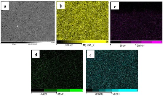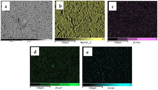 SEM-BSE micrograph (a) and corresponding EDS maps of the 0-GO sample: (b) Mg, (c) Zn, (d) Zr; (e) Si.