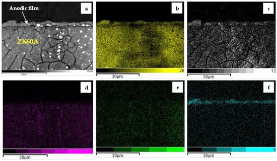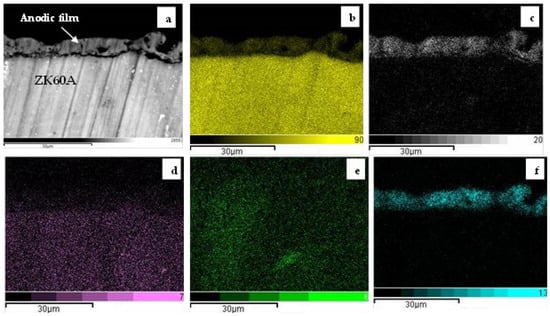 The morphological aspects of the anodized layers were further examined by SEM-BSE micrographs of the cross-sections. Figure 4 exhibits the SEM-BSE micrograph of the 0-G0 sample and corresponding EDS maps for Mg, O, Zn, Zr and Si. The anodic film is indicated by a white arrow in Figure 4a. It is permeated by pores and cracks, reaching a maximum thickness of approximately 10 µm. The presence of Mg, O and Si is clearly seen in the anodic film.