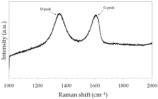 The D band is due to vibrations of sp3 hybridized carbon atoms and the G band is due to in-plane vibrations of sp2 carbon atoms (graphitic carbons) [40]. The D band is associated with defects in the hexagonal carbon lattice with graphitic structure [41]. The ratio (ID/IG) between the intensities of the D (ID) and G (IG) bands is often used as a criterion to evaluate the defective character of graphene and its derivatives [42]. The higher the ID/IG ratio, the more defective the graphene structure. The ID/IG ratio obtained from the spectrum shown in Figure 6 was 1.02, which is typical of GO structure with a low degree of functionalization [43,44].