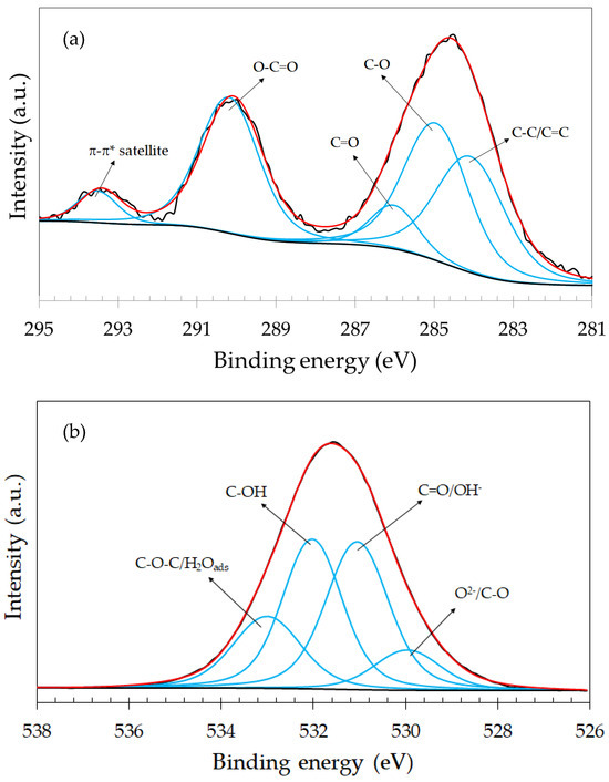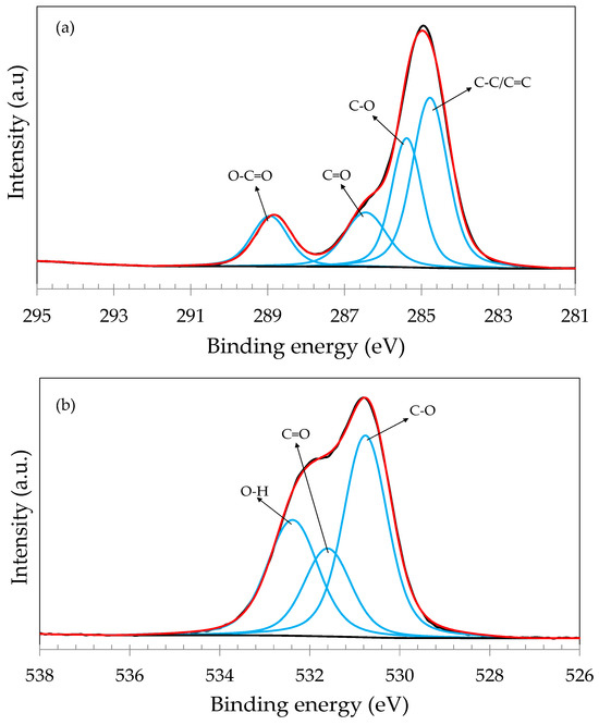 The GO particles were further characterized by XPS. Figure 7a displays the C 1s narrow scan spectrum of the GO particles. The spectrum was deconvoluted with four components that were assigned to C-C/C=C (284.7 eV), C-O (285.3 eV), C=O (286.4 eV) and O-C=O (288.8 eV) [45,46]. Figure 7b exhibits the O 1s narrow scan spectrum of the GO particles. The spectrum was deconvoluted with three components that were assigned to C-O, C=O and O-H bonds at 530.7 Ev, 531.5 eV and 532.3 eV, respectively, in agreement with the literature [47,48].