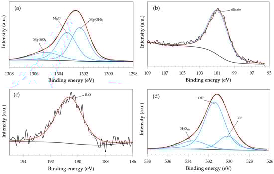 The Mg 1s, Si 2p and B 1s narrow scan spectra were not affected by GO addition. The same components were identified for 0.5-GO, 1.0-GO and 3.0-GO. The results are shown as Supplementary Materials (Figures S6–S8 for the Mg 1s, Si 2p and B 1s spectra, respectively).
