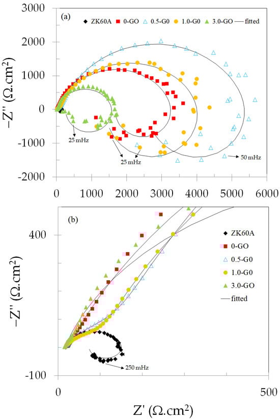 The diameters of the capacitive loops were larger for the 0.5-GO and 1.0-GO samples when compared to the 0-GO (without GO addition). By increasing the GO concentration in the anodizing bath, the diameter of the capacitive loop decreased, as seen in Figure 10a for the 3.0-GO sample, which is even smaller than that of the sample without GO addition (0-GO). Electrical equivalent circuits (EECs) were used to fit the experimental EIS data, as shown in Figure 11. The EEC shown in Figure 11a was used to simulate the EIS response of the uncoated ZK60A substrate, whereas the one shown in Figure 11b simulated the responses of the anodized samples (with and without GO addition).
