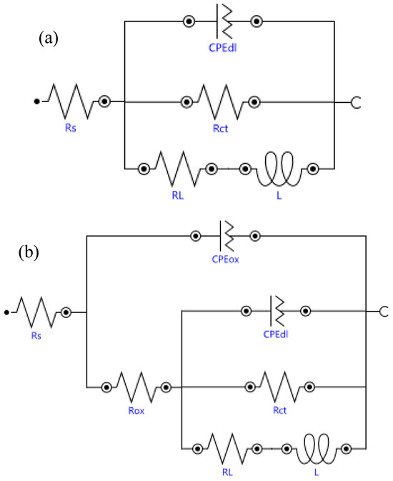 Constant phase elements (CPEs) were used instead of ideal capacitors to account for the heterogeneities of the electrode surface. The impedance of a CPE(ZCPE) is given by Equation (1), where Q is associated with the CPE capacitance, j is the complex operator, ω is the angular frequency and n is the CPE exponent which varies from 0 for a pure resistor to 1 for an ideal capacitor [59,60]. The physical meaning of the EEC parameters are given as follows: Rs is the solution resistance; CPEox is the capacitance of the oxide layer and Rox its resistance; CPEdl is the double layer capacitance and Rct is the charge transfer resistance. The local corrosion processes at the substrate are modeled by the inductive element (L) and its corresponding resistance (RL) [61]. The fitted values of the circuit parameters are displayed in Table 2.