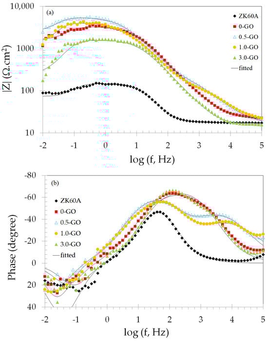 The higher impedance values of the 0.5-GO and 1.0-GO samples when compared to the 0.G0 and 3.0-GO samples are also observed in the Bode magnitude plots(log |Z| vs. log f) shown in Figure 12a. The value of the impedance magnitude at low frequencies can be used to express the corrosion resistance of the electrode surface [62,63]. This trend confirms the indication of the Nyquist plots, revealing the apparent higher corrosion resistance of the 0.5-GO and 1.0-GO samples.