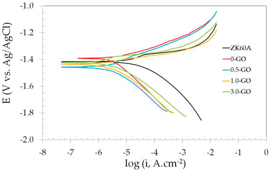 Thus, based on Equation (2), the more capacitive phase angle of the 0.5-GO sample could be due to either an increase in the area exposed to the electrolyte or an increased resistance due to a high thickness of the anodic film, or a combination of both. In fact, the SEM cross-sectional micrographs (Supplementary Materials—Figure S4) confirmed that the thickness of the anodic film was increased for the 0.5-GO sample with respect to all other GO-containing anodized layers. Moreover, the porous nature of its top surface was also clearly seen in Figure 1b. As shown in Table 1, this was accompanied by a significant increase in surface roughness that was likely due to the faster growth rate of the anodic film for the 0.5-GO sample. This would lead to a reduced capacitance of the oxide layer (CPEox). Indeed, as shown in Table 2, this sample exhibited the lowest value of CPEox. As the GO concentration in the electrolyte increased, the surface roughness decreased, as well as the thickness of the anodic film, as shown in Section 2. On one hand, this led to an increase in the oxide film capacitance with respect to 0.5-GO, as can be seen in Table 2. On the other hand, the lower growth rate of the oxide film could also lead to the formation of a denser layer, thus increasing the corrosion protection ability, as observed for 1.0-GO. However, when GO concentration is excessive, in spite of the lower growth rate of the oxide film, agglomeration of GO particles may be detrimental to its corrosion resistance. This would explain the decreased value of the oxide film resistance (Rox) for 3.0-GO, as observed in Table 2. In order to give further understanding of the corrosion behavior of the anodic films formed on the ZK60A alloy, and the effect of GO addition to the anodizing bath, potentiodynamic polarization tests were also conducted, as described in the next section.