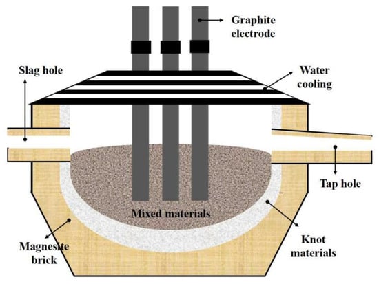 An enhanced SHS-EAH process was implemented in a tilting furnace equipped with multiple slag and alloy discharge capabilities, as depicted in Figure 1. The tilting furnace consists of four main systems: loading, heating, cooling and discharge. The loading system features stock bins for each batch of mixed ingredients and fluxing agent, a slag pan for residue slag, and an ingot mold for alloy and remaining slag, with capacities of approximately 30.0 t, 10.0 t and 15.0 t, respectively. The heating system employs a three-phase electrode with a rated capacity of 6300 kVA and a three-stage voltage regulation of 150 V, 170 V and 190 V, designed to initiate the SHS-EAH reaction and maintain the temperature of the system. The cooling system primarily comprises a water-cooling roof and a water-cooling wall. The discharge system includes a slag hole for the discharge of molten slag and a tap hole for the casting of molten slag and alloy.
