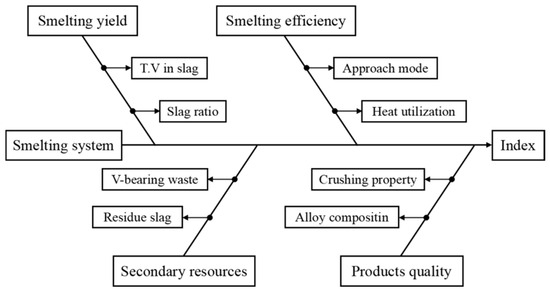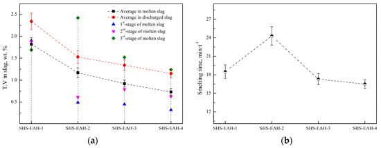 where wV-S and wV-A are the mass content of vanadium in residue slag and alloy, respectively, with units of wt.%; RS/A is the mass ratio of slag and alloy with units of kg·kg−1; MO and VO are the output product mass of alloy and mass content of vanadium in smelting residue, respectively; MI and VI are the input mass and mass content of vanadium in original vanadium source, respectively, with units of kg. The criterion for the reaction endpoint is mainly based on the standard of T.V in slag decreasing less than 0.1% per 10 min.