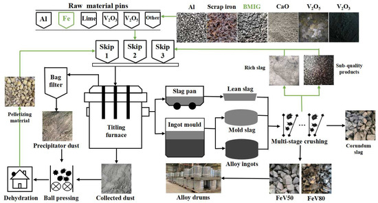In order to achieve the efficient utilization of waste in the whole process, the systematically produced and collected vanadium-bearing secondary resources, such as precipitator ash, enriched dust and vanadium-rich residue slag, were pelleted and dried for secondary smelting. In order to achieve the low-cost smelting of raw materials, the traditional high-price scrap iron was replaced by BMIG, which was obtained by magnetic separation of coarse vanadium slag in the front operation. Through the above technological measures, the on-line circulation of waste materials and the demand of low-cost raw material smelting were intended to be established.