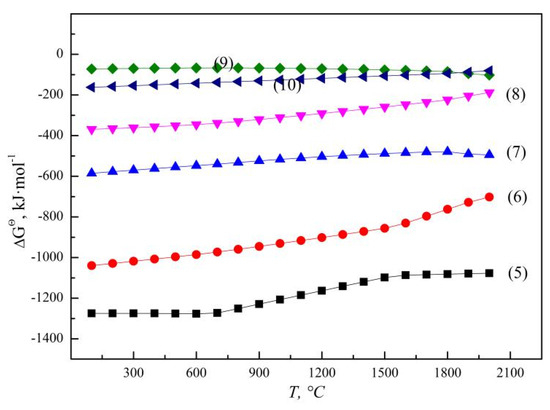 According to the principle of step-by-step reduction, the SHS reaction of vanadium oxides by aluminothermic reduction are gradually reduced from a high valence state to a low valence state, V2O5 can be reduced to V2O4, V2O3, VO and even to metal with the increase in temperature and Al addition, as illustrated by reactions (5) to (8) [37], and the Gibbs free energy (ΔGΘ) for aluminothermic reduction of different vanadium oxides are presented in Figure 5. The un-reduced vanadium with an occurrence state of V2O3 or VO in molten slag is related to the content of the reduced product V and reducing agent Al [38]. When slag and alloy coexist in a smelting system, a large amount of reduced metal vanadium can form in the molten alloy phase through the equilibrium reaction between low-valence V2O3 and VO and Al, as shown in reaction (9). The corresponding ΔGΘ for reaction (9) was calculated to be −85.0 kJ·mol−1 at 1800 °C, which means that VO is more thermodynamically stable than V2O3. On the other hand, when slag and alloy are separated completely after smelting, VO in molten slag may be oxidized again. According to reaction (10), the relative stability of VO and V2O3 is related to the system temperature and ambient oxygen partial pressure. The equilibrium oxygen partial pressure is calculated to be 0.41 Pa at 1800 °C, while the actual oxygen partial pressure during operation is much higher than the equilibrium oxygen partial pressure, and VO will be oxidized to be V2O3.