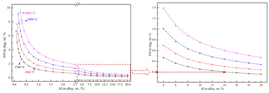 where MAl2O3, MVO, MAl and MV are the molar masses of Al2O3, VO, Al and V, respectively. wAl2O3, wVO, wAl and wV are the mass fraction of Al2O3, VO in the slag and Al and V in the alloy, respectively, wt.%. rslag is the mass ratio of the actual slag in the furnace to the theoretical total slag, %. According to Equations (13)–(15), the reduction limitation of reaction (8) is mainly affected by the standard Gibbs free energy, aluminum addition coefficient, slag–alloy mass ratio and different alloy grades. The relationship between the VO content in the slag and the Al content in the alloy at different temperatures was calculated as shown in Figure 7. The calculated results indicate the great influence of the Al content on the VO content, which provides theoretical guidance for the experimental aluminothermic reduction. For example, the theoretical VO content in the slag decreases from 3.55 wt.% to 0.64 wt.% with the increase in the aluminum content from 0.2 wt.% to 2.5 wt.% in FeV50 at 1700 °C. With the further increase in the Al content to 20.0 wt.%, the theoretical VO content and the corresponding T.V in the slag decreases to 0.16 wt.% and 0.12 wt.%, respectively. In order to effectively control the vanadium loss in the slag and reduce the VO content to less than 0.2 wt.%, the corresponding Al content in the alloy should be higher than 14.0 wt.%, which means a great excess of Al should be added to promote a deep reduction.