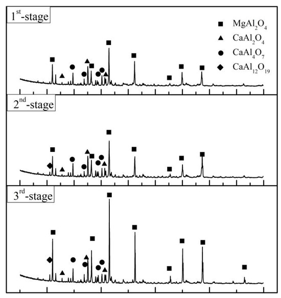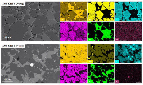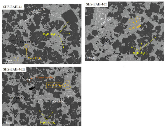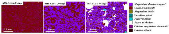 On the other hand, the T.V content of the discharged residue slag is significantly higher than that of the on-line molten slag in each stage, which was mentioned above. Taking SHS-EAH-4 for example, the T.V content of the three-stage residue slag by air cooling is 0.53 wt.%, 0.76 wt.% and 1.65 wt.%, while the T.V content in the corresponding molten slag is 0.32 wt.%, 0.63 wt.% and 1.24 wt.%, respectively. Through the SEM-EDS and MLA analysis of the residue slag in Figure 10 and Figure 11, the mineral phases in the slag were composed of magnesium aluminum spinel, calcium aluminate, vanadium spinel and ferrovanadium [36]. Vanadium is mainly combined with magnesium and aluminum to form a spinel structure in the existing state of isomorphism, and the reduced vanadium is precipitated at the grain boundary in the form of vanadium-rich spherical particles. The mass proportion of alloy in the three-stage slag is 0.06 wt.%, 0.13 wt.% and 1.01 wt.%, which indicates that the separation of the slag and alloy is not completed in the process of slag discharging and alloy casting, especially the casting in the third stage.