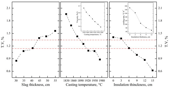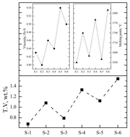 After optimizing the aluminum addition coefficient of each stage, the main influencing factors affecting the separation of the slag and alloy were investigated based on the industrial production performance. As can be seen from Figure 13, the T.V content of the residue slag decreases with the decrease in the viscosity and increases with the increase in the melting point of the slag. In the process of industrial production, the main components of molten slag are composed of 65.0 wt.% Al2O3, 15.0 wt.% CaO and 20.0 wt.% MgO, which is similar to that of sample S-4 in Section 3.2.1. The viscosity and melting point of the slag are about 0.46 Pa·s and 1780 °C, respectively, while the corresponding T.V content is 1.33 wt.%. It is beneficial to reduce the T.V content by increasing the CaO addition and optimizing the knot strength of the furnace to improve the slag characteristics. According to Figure 14, decreasing the slag thickness and increasing the casting temperature and the insolation thickness are conducive to the settlement of alloy particles and the decreasing of vanadium loss. When the slag thickness decreased from 54.9 cm to 30.2 cm, the T.V in the residue decreased from 1.56 wt.% to 0.85 wt.%. When the casting temperature increased from 1829 °C to 1972 °C, the T.V in the residue decreased from 1.96 wt.% to 0.88 wt.%. While when the isolation thickness increased from 0 cm to 15.0 cm, the corresponding T.V in the residue decreased from 1.41 wt.% to 0.62 wt.%. In conclusion, the separation efficiency of the slag and alloy was obviously improved, and the average T.V in the residue slag decreased from 1.15 wt.% to 0.65 wt.% at the slag approximate composition of Al2O3 65.0 wt.%, CaO 18.0 wt.%, MgO of 15.0 wt.%, and slag discharging rate of 80.0 wt.%, casting temperature of 1950 °C and insolation thickness of 15 cm.