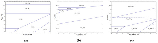 Phase diagram of C, P, S of V-Fe-O system at 1800 °C. (a) V-Fe-C-O; (b) V-Fe-P-O; (c) V-Fe-S-O.