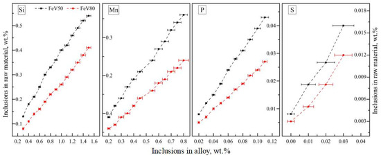 According to the distribution relation of inclusions between raw materials and alloy, the impurities controlling the standard of mixed raw materials for different ferrovanadium grades was established. As can be seen from Table 8, the upper limitation of FeV50-A and FeV80-A for Si, Mn, P and S are 0.50 wt.%, 0.20 wt.%, 0.017 wt.% and 0.04 wt.% and 0.30 wt.%, 0.12 wt.%, 0.01 wt.% and 0.04 wt.%, respectively. The distribution mass ratio of Si, Mn, P, and S entering the alloy is 85.1~92.6 wt.%, 92.3~95.7 wt.%, 72.5~82.3 wt.% and 0~42.7 wt.%, respectively.