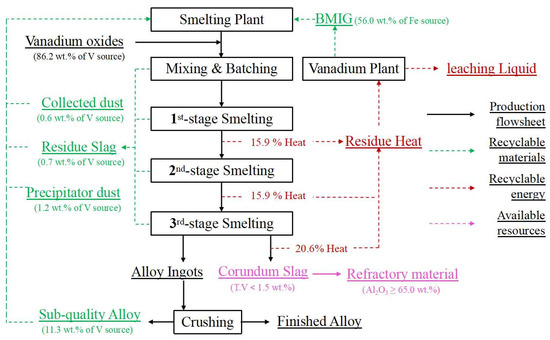 Based on the distribution rules and control standards established above, a new smelting process is proposed for the site of the vanadium extraction plant in Figure 21. In the process, 86.2 wt.% of the vanadium sources are supplied by vanadium oxides from the vanadium slag plant, while the rest of the vanadium sources are recycled by 0.6 wt.% of collected dust, 0.7 wt.% of vanadium-rich residue slag, 1.2 wt.% of precipitator dust and 11.3 wt.% of sub-quality alloy from the smelting plant. A total of 56.0 wt.% of the iron resources are supplied by BMIG from the vanadium slag plant. From the economic perspective, the process is feasible as long as heat waste can be reasonably utilized. During the industrial smelting process, the slag of the three smelting stages makes up 15.9%, 15.9% and 20.6% of the reaction and electric auxiliary heat in the furnace, respectively. And the heat is taken away for the heating the leaching liquid of the vanadium extraction plant from 25 °C to 60 °C. On the other hand, the cooled corundum slag is used in the preparation of industrial refractory materials and raw materials for replenishing the tilting furnace. With this proposed industrial waste treatment process, vanadium-bearing and ferrous-bearing secondary resources are effectively recycled and utilized, and the impurity elements of the alloy are effectively controlled.