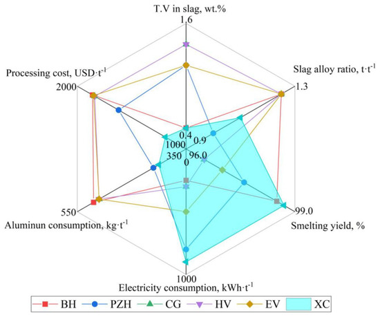 Through the in-depth analysis of the preparation theory of the ferrovanadium alloy and the optimization control of the technological conditions, the reduction of vanadium, separation of slag and alloy, and comprehensive utilization of secondary resources have been significantly improved. At present, the new multi-stage double-gradient battering and smelting process of DG-ADP has been fully applied and promoted in PG Group(XC) in China. The internal circulation of the vanadium-bearing materials in the ferrovanadium smelting system and the external circulation of the iron and residue slag applied in the same system are established, and the zero discharge of solid and liquid waste from ferrovanadium production line has been achieved. Compared with other typical ferrovanadium preparation enterprises listed in Table 9 and Figure 22, the new process has significant advantages in terms of the smelting yield, smelting efficiency, aluminum consumption, product quality and other aspects. On the one hand, the key technology of the intensive smelting and separation of ferrovanadium is proposed based on the V-Al-O reduction equilibrium theory and the infinite fluid-free sedimentation theory, which enabled the deep reduction of the vanadium in the slag and the efficient separation of the slag–alloy. The T.V content in the slag was reduced from 2.34 wt.% to 0.60~0.90 wt.%, and the slag–alloy ratio was reduced from 1.35 to 1.10. The corresponding smelting yield increased from 93.7 wt.% to 98.0~98.7 wt.% and the aluminum consumption decreased from 510 kg·t−1 to 400~420 kg·t−1. On the other hand, based on the establishment of the precise batching model, the on-line circulation of the vanadium-bearing secondary resources and low-cost raw material replacement are realized, and the product quality was further effectively predicted and controlled. The utilization rate of the secondary resources and the substitution rate of low-cost raw materials reach 100%.
