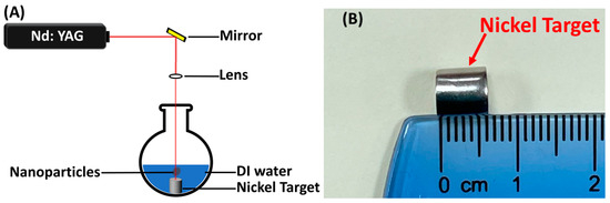 (A) Sketch displaying the pulsed laser ablation in liquid set-up used in this investigation. It is a top-down PLAL synthesis protocol. (B) The target is a cylindrical pellet made of pure Ni (@ 99.995% from Kurt Lesker).