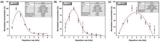 Concentration of the colloids measured at different repetition rates for each laser beam power used (A) P = 5.8 W, (B) P = 7.5 W and (C) P = 10.5 W.