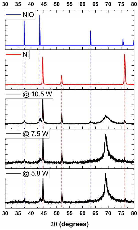 Afterwards, X-ray diffraction (XRD) was conducted with a Rigaku Miniflex 600 to determine the structural properties of the Ni/NiO nanoparticles produced at the best repetition rate for each of the selected powers (1.6 kHz @ 5.8 W, 1.9 kHz @ 7.5 W and 3.8 kHz @ 10.5 W). After synthesis, these colloids underwent centrifugation using a Sorvall Legend Micro 17 (Thermo Scientific, Waltham, MA, USA). The precipitates were then carefully dried onto silicon wafers for detailed examination. Significantly, as seen in Figure 3, the XRD patterns show diffraction peaks at 2θ angles of 37.2°, 43.1° and 62.8° across all three samples. These peaks are indicative of the (1 1 1), (2 0 0) and (2 2 0) lattice planes of NiO, confirming its presence within all the samples. Additionally, the patterns exhibited peaks at 44.4°, 51.8° and 76.3°, corresponding to the (1 1 1), (2 0 0) and (2 2 0) lattice planes of Ni. Furthermore, the peak observed in all three samples at 69.12° is attributed to the silicon wafer substrate onto which the nanoparticles were deposited. The intensity of the XRD peak is related to the number of atoms in the crystal that are capable of scattering X-rays. From Figure 3, it is obvious that the intensity of the Ni peaks is much larger than the intensity of NiO peaks, confirming that Ni is the dominant phase compared to NiO; therefore, the presence of NiO could only be due to the surface oxidation of the Ni core [53].