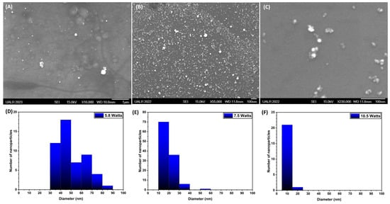 Subsequently, scanning electron microscopy (SEM) analysis was performed on the nanoparticles synthesized under optimal conditions (1.6 kHz @ 5.8 W, 1.9 kHz @ 7.5 W and 3.8 kHz @ 10.5 W) to determine their size and shape (Figure 4). This analysis was performed using a JEOL JSM7000F SEM system (JEOL Ltd., Tokyo, Japan) operated at an acceleration voltage of 15 kV. The SEM images, presented in Figure 4, show the spherical shape of the nanoparticles for all the analyzed samples. From Figure 4, a trend was observed between the laser beam power and the size of the nanoparticles. Indeed, as power increased, the size of the nanoparticles decreased. Quantitively, Figure 4 also presents the size distribution corresponding to each SEM image. The average sizes of the nanoparticles prepared at 5.8 W, 7.5 W and 10.5 W was analyzed by ImageJ software (version 1.53t) and were determined as 49 ± 18 nm, 19 ± 6 nm and 8 ± 3 nm, respectively. The diameters of the nanoparticles were measured manually one particle at a time by ImageJ software (version 1.53t). The repetition rates 1.6 kHz, 1.9 kHz and 3.8 kHz were used at powers 5.8 W, 7.5 W and 10.5 W, respectively, to maximize the productivity of the nanoparticles.