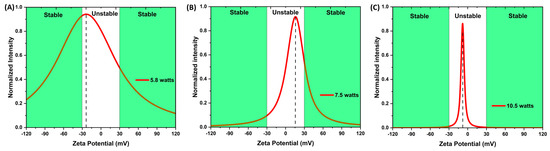 Zeta potential of the colloids synthesized by PLAL under the following conditions: (A) 1.6 kHz @ P = 5.8 W, (B) 1.9 kHz @ P = 7.5 W and (C) 3.8 kHz @ P = 10.5 W.