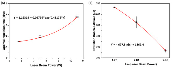 (A) Optimal repetition rate versus laser beam power. (B) Cavitation bubble lifetime versus laser beam power.