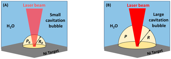 Sketch explaining the correlation between laser beam power and cavitation bubble radius: (A) low laser beam power; (B) high laser beam power.