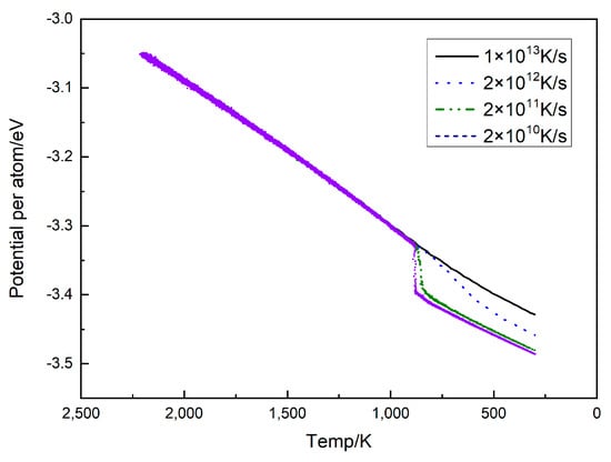 The variation curve of the average atomic potential energy with the temperature is an accurate and objective indication of the microstructural changes in the alloy system during rapid cooling. The curve enables a simple and direct analysis of the phase transition process of the system. In general, when the curve is a straight line, it indicates the absence of a phase transition in the system. If the curve deviates from the straight line and changes gradually, but not abruptly, a phase transition occurs, and amorphous structures are formed. If the curve deviates significantly from the straight line and changes suddenly, crystals are generated in the system [,,]. The change curves of the average atomic potential energy with the temperature for cooling rates of 1 × 1013 K/s, 2 × 1012 K/s, 2 × 1011 K/s, and 2 × 1010 K/s are shown in Figure 1.