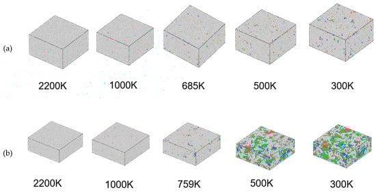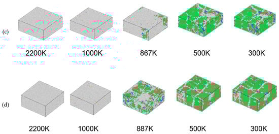 At the cooling rate of 1 × 1013 K/s, the average atomic potential energy reduced continuously with the gradually lowering alloy temperature. An observation can be made that the APE-Temp curve is not linear, and there is a subtle breakpoint that appears around 685 K. Such findings indicate that the system underwent phase transformation and amorphous structures formed at 685 K. At the cooling rate of 2 × 1012 K/s, the APE-Temp curve is continuous without sudden changes, but both the bending degree of the curve and the breakpoint temperature are higher than those at 1 × 1013 K/s. The APE-Temp curves at cooling rates of 2 × 1011 K/s and 2 × 1010 K/s show abrupt changes at 867 K and 887 K, respectively, suggesting that crystals were generated in the system. The APE-Temp curves indicate an increase in the phase transition temperature with decreasing cooling rates. Lower cooling rates correspond to a decrease in the average atomic potential energy and increased structural stability of the system following phase transition. To facilitate the observation of the crystallization process of alloys at different cooling rates, visualization software was used to further analyze the crystal configuration. In Figure 2, the color gray represents crystal classes that are classified as “other” (not belonging to any of the common crystal classes), green indicates the crystal type as FCC, blue signifies the crystal type as BCC, and red denotes the crystal type as HCP.