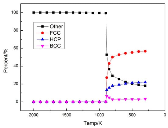 To analyze the variation in the crystal type with the temperature, the proportions of different crystal types at different temperatures were extracted using visualization software (Figure 3). At the cooling rate of 2 × 1010 K/s, the atoms were irregularly distributed liquid in the alloy temperature range of 2200–887 K. At 887 K, the alloy began to crystallize. In the temperature range of 500 K and 300 K, the alloy appeared in the form of crystals. Such findings are consistent with the aforementioned results.