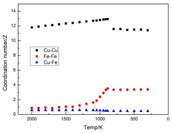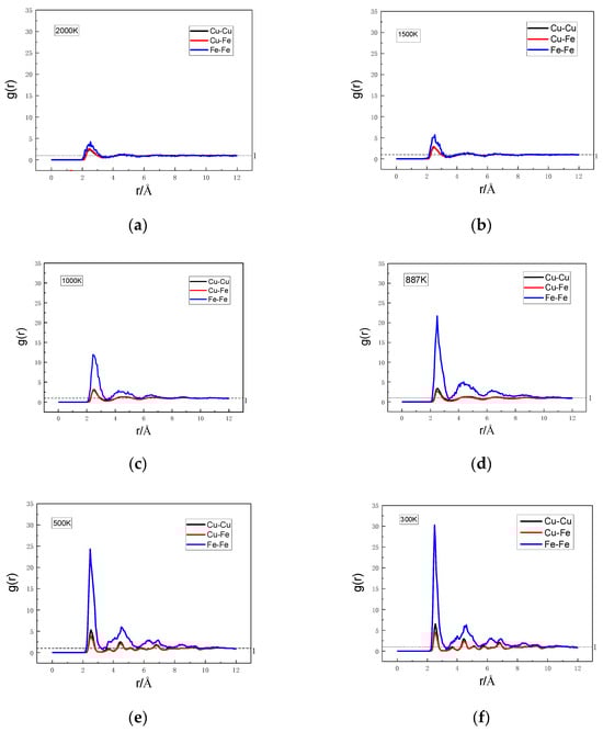 At 2000 K, the coordination number of the Cu-Cu pairs was 11.8078, far greater than 0.88302 of the Fe-Fe pairs and 0.58139 of the Cu-Fe pairs. As the temperature decreased, the coordination number of the Cu-Cu pairs increased, attaining the largest value at 887 K. Subsequently, the coordination number decreased, and the alloy began to crystallize. At 800 K, the crystallizing process was almost complete, and the coordination number of the Cu-Cu pairs remained basically unchanged as the temperature continued to drop. The coordination number was 11.4232 at 300 K. Different from the variation curve of the coordination number of the Cu-Cu pairs with the temperature, the coordination number of the Fe-Fe pairs exhibited evident changes. The coordination number of the Fe-Fe pairs was 0.88302 at 2000 K and increased with the decline in the temperature. The growth rate of the coordination number of the Fe-Fe pairs accelerated greatly as the temperature dropped to below 1400 K, indicating that the Fe atoms were surrounded by an increasing number of Fe atoms, and the Fe atoms were arranged more closely. At a temperature of 887 K, the coordination number of the Fe-Fe pairs attained its maximum value of 3.52145. Subsequently, as the temperature decreased, the coordination number showed a slight decrease. There was a minimal change in terms of the coordination number of the Cu-Fe pairs, but there was evidence to suggest a decrease with the decline in the temperature. Such results demonstrate that the binding force between the Cu and Fe atoms was weak and there was a repulsive force between them. Based on the variation in the coordination number with the temperature, a conclusion could be drawn that Fe atoms are more likely to be the nearest neighbor of atoms. As the temperature decreased, the arrangement of the Fe-Fe pairs became more compact. The Fe atoms demonstrated a proclivity to actively combine with each other, which is evidenced by the continuous change in the coordination number with the temperature. Such findings indicate that the formation of Fe clusters is an ongoing process.