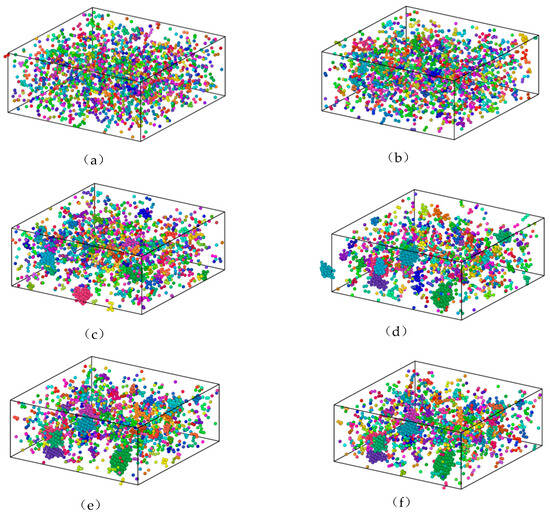 The distribution of Fe atoms in Cu95Fe5 alloys at (a) 2000 K, (b) 1500 K, (c) 1000 K, (d) 887 K, (e) 500 K, and (f) 300 K.
