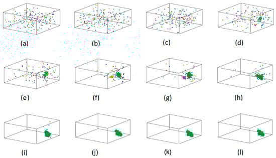 The distribution of Fe atoms in the largest cluster at (a) 2000 K, (b) 1500 K, (c) 1100 K, (d) 1050 K, (e) 1000 K, (f) 950 K, (g) 930 K, (h) 915 K, (i) 887 K, (j) 800 K, (k) 500 K, and (l) 300 K.