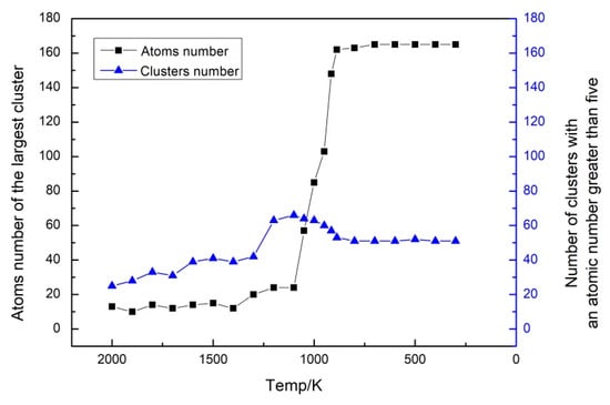To further explore the relationship between the growth of Fe clusters and nucleation rate during rapid cooling, a graph was drawn (Figure 9), which shows the variations in the number of atoms in the largest cluster and the number of clusters containing more than five atoms with the temperature at different times. Since clusters containing fewer than five atoms exhibit instability, only those clusters containing more than five atoms were considered for counting purposes, thereby facilitating the subsequent analysis and discussion of the research outcomes.