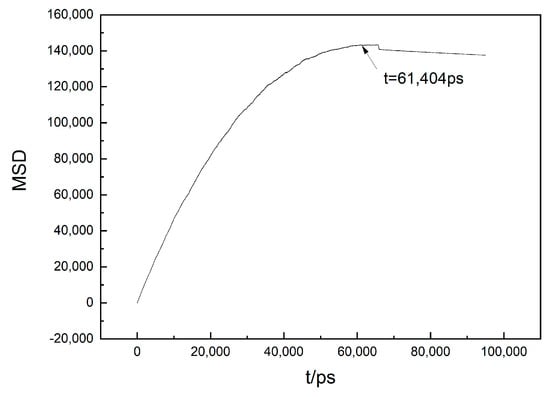 The atom diffusion process is a significant factor in the analysis of the atom precipitation mechanism, and thus, the diffusion coefficient of Fe atoms in the system needs to be calculated [,,]. During the MD simulation of the alloy system, the diffusion coefficient of atoms is typically calculated by measuring the mean square displacement (MSD) [,] of atoms.