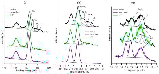 Comparison of the native and nanotube surface XPS spectra: (a) Ti 2p, (b) Nb 3d, (c) Ta 4f. The full lines are used for 2p3/2, 3d5/2, 4f7/2 and dashed lines for 2p1/2, 3d3/2, 4f5/2 peaks.