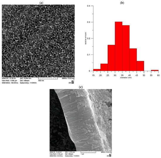 The surface geometry characteristics of the nanostructured alloy are shown in Figure 2, where the histogram of the internal diameters is also shown. This parameter ranged from 15 to 60 nm, with the most frequent distribution between 30 and 40 nm. The length of the nanotubes was 1690 ± 72 nm. These results are in agreement with previous work, where the mechanical properties and growth and differentiation of human mesenchymal cells, among other things, were tested [30].
