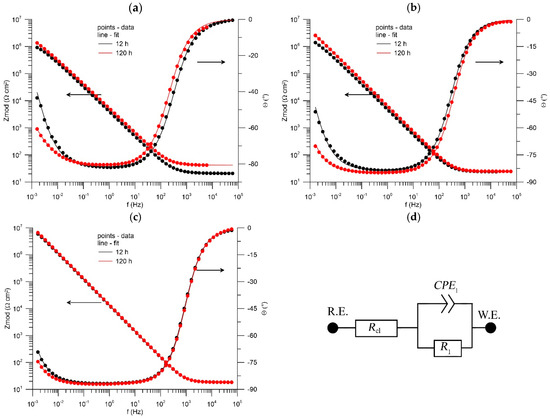 A stable system over time in the environment is required to be able to measure the change in potential, reflecting the change in pH of the environment. For this reason, the studied surfaces were exposed to saline solution. The samples were monitored for 5 days regarding their open circuit corrosion potential and polarization resistance. The results of the measurements are summarized in Figure 3. In the case of the native surface, there was an increase in both the open circuit corrosion potential and the polarization resistance throughout the exposure. This is consistent with the results of electrochemical impedance spectroscopy. The impedance spectra were evaluated using an equivalent circuit that describes a compact oxide layer (Figure 4a,d) [31,32], where the resistance R1 represents the charge transfer resistance and the CPE1 (constant phase element) is equivalent to the combined capacitance of the passive layer and the electrical double layer. The goodness of fit (χ2), which is the calculated sum of the weighted residuals, was on the level of 10−4 or better. During the exposure, there was a threefold increase in the charge transfer resistance and a decrease in the layer capacitance (Table 2), i.e., an increase in the layer thickness and a slight decrease in the α parameter (an increase in the capacitance distribution), due to the increase in the layer non-uniformity. In the parallel measurement, the Stern–Geary coefficient was estimated to have a value of 0.043. In the case of the hydrothermally treated sample, there was a sharp increase in the open circuit potential during the first ten hours of exposure (Figure 3), with only a slight fluctuation thereafter. The polarization resistance increased slightly throughout the exposure, but the change was not as marked as in the case of the native surface. The impedance spectra of the hydrothermally treated sample confirm the minor evolution of the surface layer during the exposure. There was an increase in the charge transfer resistance; however, here, the fitting result is already affected by the significant error associated with the highly capacitive nature of the surface. For such surfaces, the impedance spectrum linearly increases in the low frequency region and no semicircle appears in the Nyquist presentation, so the fitting algorithm cannot reliably evaluate the charge transfer resistance. In such cases, its value is only indicative and changes of up to an order of magnitude are negligible. The capacitance value at the beginning of the exposure is lower than the capacitance of the native surface after 120 h (Table 2). It can therefore be assumed that the hydrothermal treatment has led to an increase in the thickness of the oxide layer, and it is possible to eliminate the need to stabilize the native layer in this way. There was a slight decrease in capacitance during exposure, indicating a restructuring of the surface, which is associated with an increase in the corresponding α value. The nanostructured surface showed stability from the beginning of the exposure, both in terms of open circuit potential and polarization resistance. Only minor fluctuations were observed during the exposure without any obvious trend. The stability of the surface was also confirmed via impedance spectroscopy, with no significant changes in the spectra or the values of the individual elements used for evaluation during the exposure. The capacitance of the nanostructured surface was the lowest of all the treatments studied. It therefore corresponds to the thickest layer.